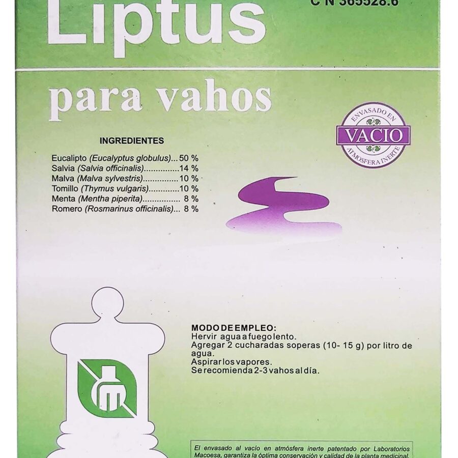 Liptus® para Vahos consiste en plantas de eucalipto, salvia, malva, tomillo, romero y menta que están envasadas por un procedimiento original en atmósfera inerte que garantiza la completa esterilización y que aumenta el periodo de tiempo en que las plantas medicinales conservan sus principios activos y propiedades organolépticas. Se utiliza hirviendo agua, agregando el preparado, y posteriormente inhalando los vahos.